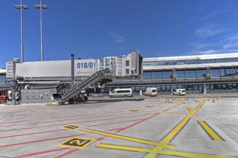 Hamburg Airport und Emirates präsentieren neue A380-Position mit drei Fluggastbrücken