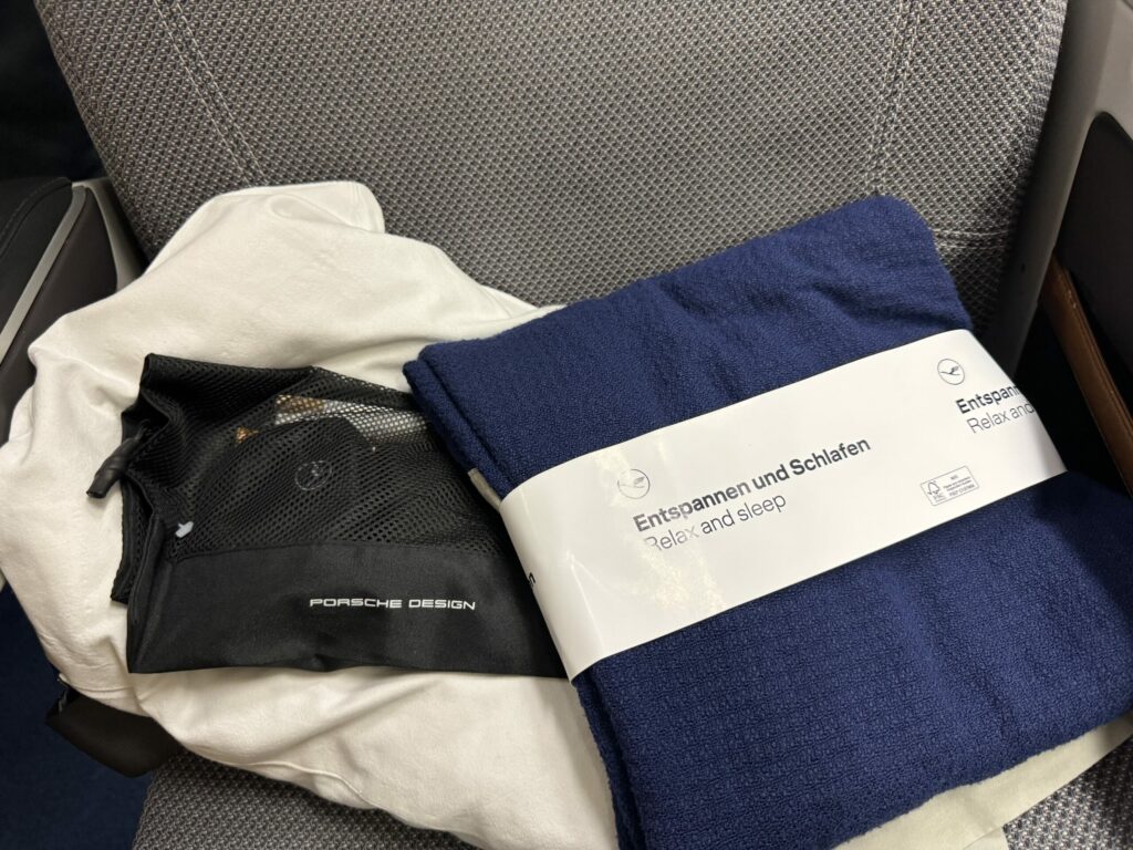 Ebenfalls positiv ist, dass die Lufthansa auf den Flügen der Langstrecke ein weiches Kissen sowie eine relativ kleine und dünne Decke zur Verfügung stellt. Außerdem gibt es einen Beutel, der als Amenity Kit dient. Dieser beinhaltet neben einer Zahnbürste mit Zahnpasta, eine Schlafmaske, einen Gehörschutz, ein Reinigungstuch sowie schwarze Socken. Insgesamt eine schöne Aufmerksamkeit.