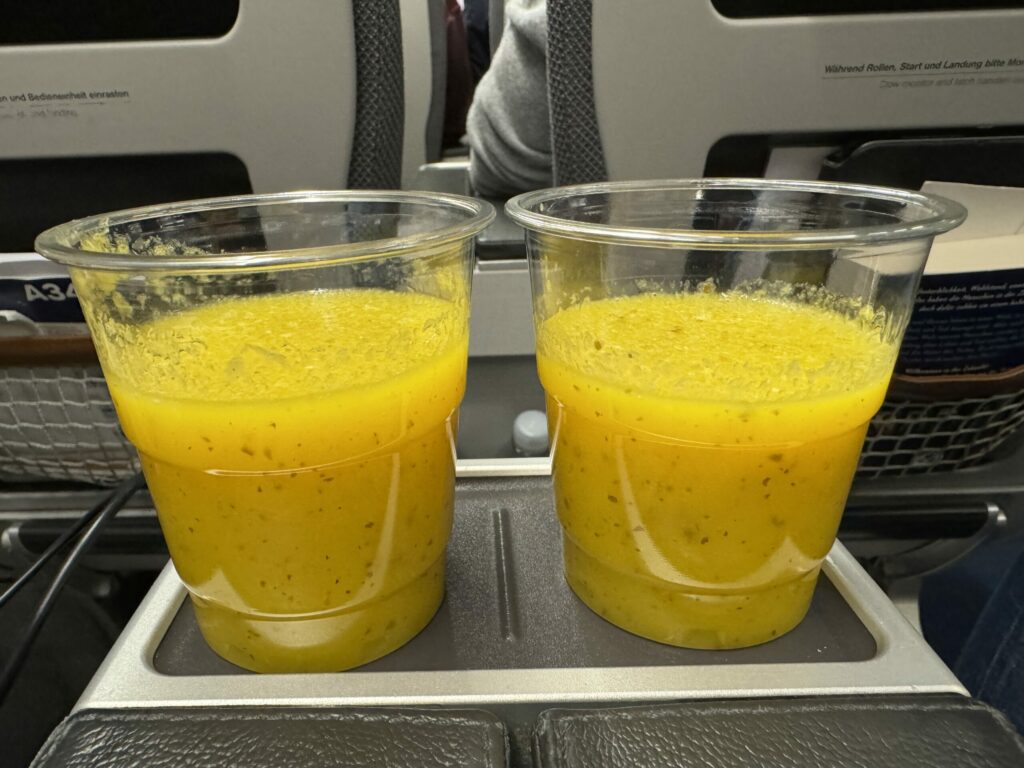 Insgesamt wirkt der Sitz – gerade im Vergleich zu der sonstigen Ausstattung der LufthansaLufthansa – neu und geräumig. Auch der Neigungswinkel der Rückenlehne ist deutlich besser als in der Economy Class. Ebenfalls positiv: Eine Fußstütze, viel Stauraum und ein großer Tisch runden den ersten Eindruck ab. Doch klar ist auch, dass dieser Sitz keinesfalls mit einem Business Class Erlebnis vergleichbar ist. Alleine, dass die Kabine mit anderen Economy Gästen geteilt wird, führt zu einer hohen Lautstärke und vermittelt eher ein Economy- als ein Business-Gefühl. Positiv ist insbesondere der Welcome-Drink, der mit Minze und Orange eine gute Mischung darstellt und Vorfreude auf den Flug macht.
