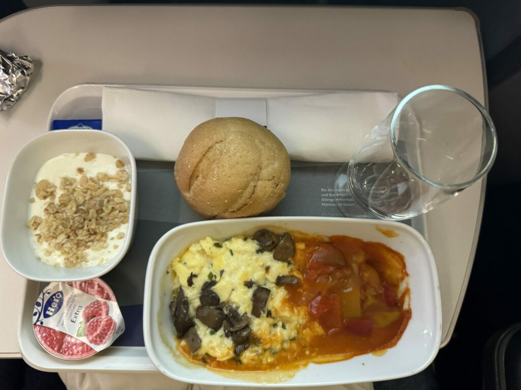Der Service ist während des gesamten Flugs auf Economy Niveau. Die Flugbegleiterin hatte mich bei einer Mahlzeit vergessen und ich musste sie auf die fehlenden Getränke aufmerksam machen. Ein Nachschenken der Getränke fand nicht statt. Auch das Frühstück – Teigtaschen mit Frischkäse – wirken etwas deplatziert. Lecker war es dennoch.