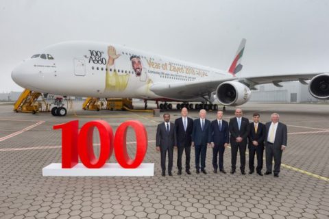 Hamburg/Dubai, 03. November 2017 Emirates bekommt seine 100. A380: Im Rahmen einer festlichen Zeremonie mit Seiner Hoheit Sheikh Ahmed bin Saeed Al-Maktoum, Chairman und Chief Executive Emirates Airline & Group, feierten Sir Tim Clark, President Emirates … mehr