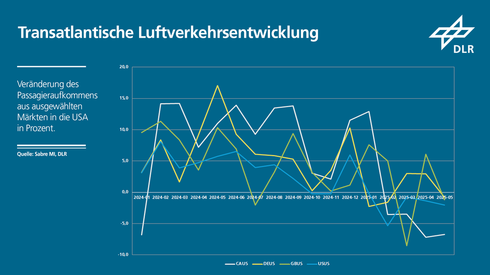 Trotz kurzfristiger Rückgänge zu Beginn des Jahres 2025 bleibt der Luftverkehr Deutschland–USA auf stabilem Niveau. Im Januar und Februar wurden rund zwei Prozent weniger Passagiere registriert als im Vorjahreszeitraum, was laut DLR im Zusammenhang mit einer erhöhten öffentlichen Aufmerksamkeit rund um US-Einreisebestimmungen stand.