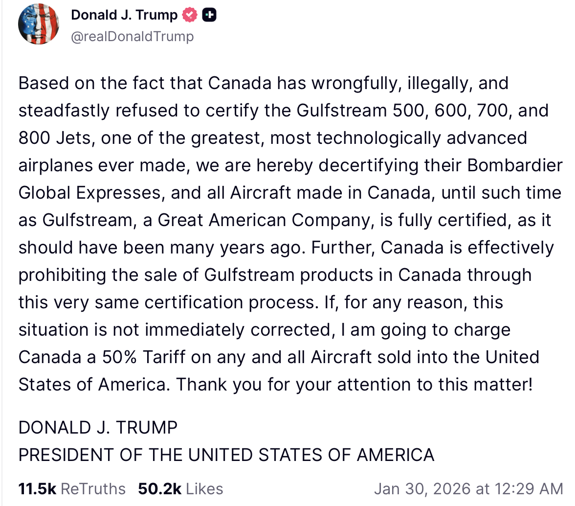 Auslöser ist nach Trumps Darstellung die angebliche Weigerung der kanadischen Luftfahrtbehörde Transport Canada, mehrere Business Jets des US-Herstellers Gulfstream zu zertifizieren. Trump spricht von einer Benachteiligung eines „großartigen amerikanischen Unternehmens“ – und droht mit drastischen Gegenmaßnahmen.