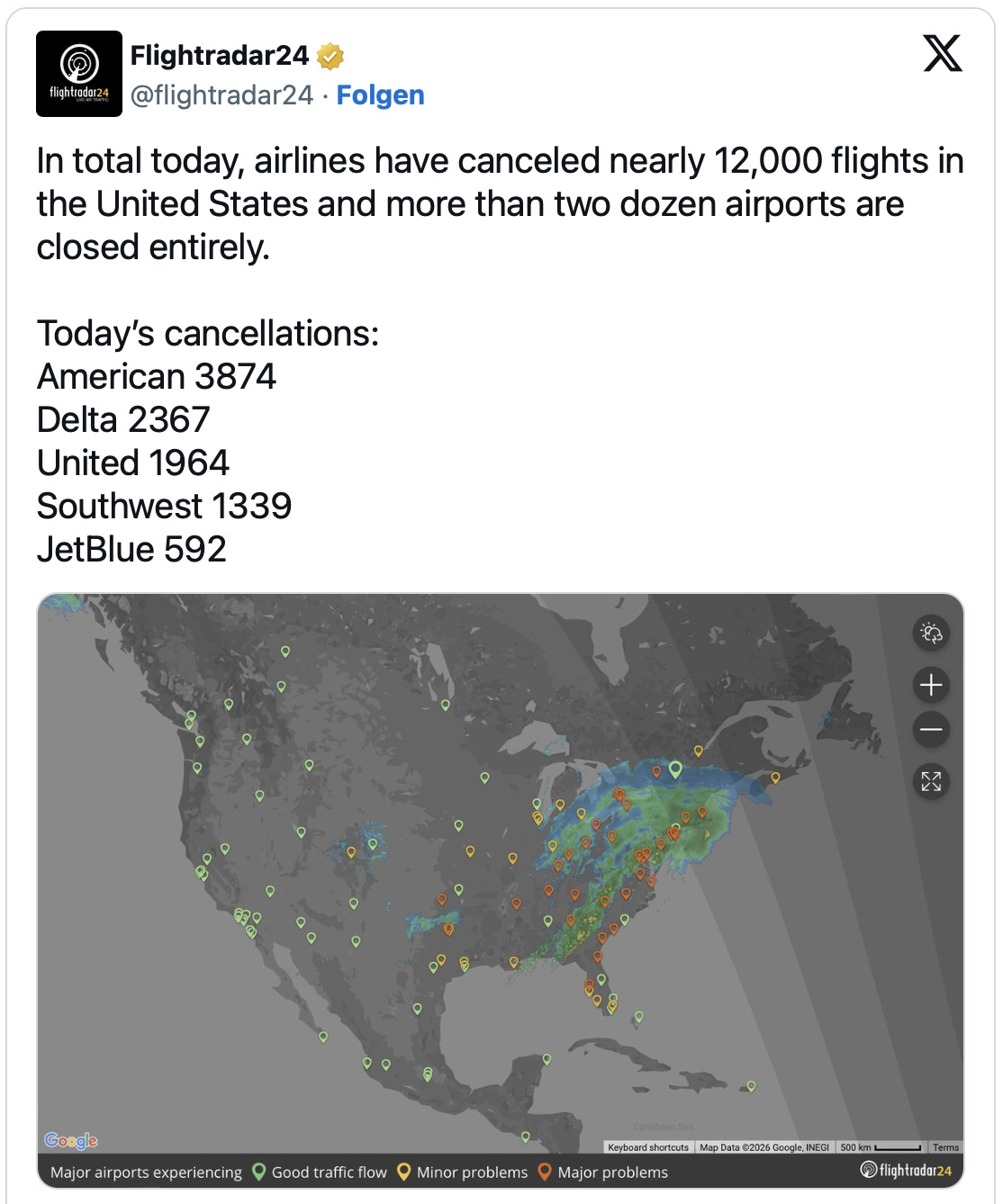 Flightradar meldete über 12.000 Flugausfälle. Bild: Flightradar24 via X
