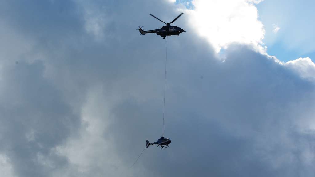 Der fünfsitzige Schulungshubschrauber der Bundespolizei war zuvor wegen technischer Probleme gelandet, wie die Feuerwehr mitteilte. Der Lastenhubschrauber habe den etwa eine Tonne schweren anderen Hubschrauber mit einem Seil hochgezogen und auf einer Straße abgesetzt. Dort sei er auf einen Tieflader geladen worden. «Eine Hubschrauber-Bergung haben wir bestimmt seit über 15 Jahren nicht mehr gehabt», sagte ein Angehöriger der Bundespolizei. Im Einsatz war außerdem ein dritter Hubschrauber – um die Aktion zu filmen.