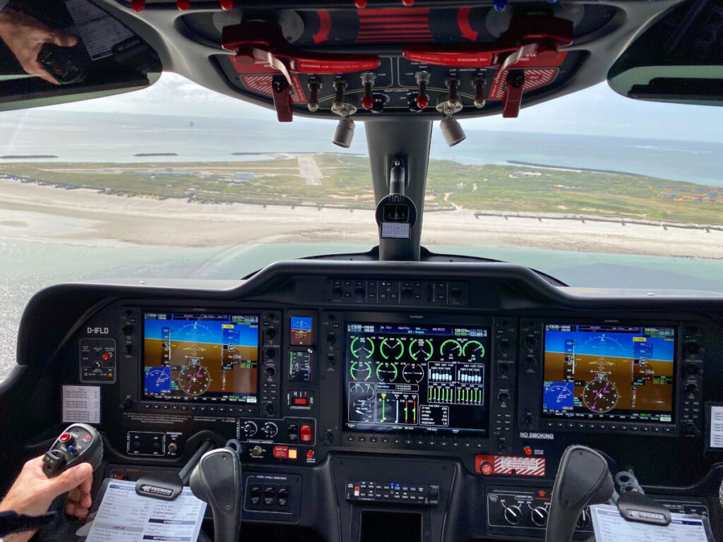 Auf Einladung der FLN hatten wir die Gelegenheit, den neuen Stolz der Flotte auf einem Sonderflug nach Helgoland kennenzulernen. Geflogen wird die Maschine an diesem Tag von FLN-Flugbetriebsleiter Stephan Kaneider, der uns das Flaggschiff der Airline vorstellt. Von außen betrachtet, ist die Tecnam deutlich größer als die Islander. Die elegante Form der Nase lässt die Handschrift der Pascales nicht verleugnen. Bei der STOL-Variante wurde die dreiteilige Tür der Standardversion durch eine einzelne große und nach oben klappende Tür ersetzt, die auch für die Beladung mit Fracht gut geeignet ist. Der Einstieg erfolgt über ausklappbare Treppenstufen. Das Innere der Kabine besticht durch ein modernes Design und bietet den Fluggästen Einzelplätze mit Getränke- und Handyhalter sowie Frischluftdüsen und USB-Ports. Das ist ein deutliches Upgrade gegenüber der Islander. Noch viel großer ist der Unterschied für die Piloten, deren Arbeitsplatz mit drei großen integrierten Bildschirmen deutlich größeren Maschinen ähnelt.