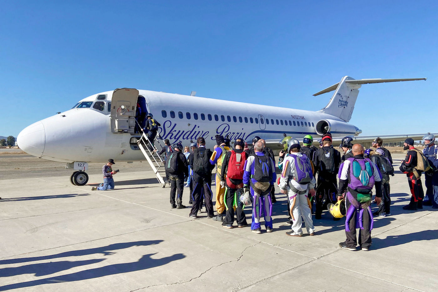 Die N127NK registrierte DC-9-21 von Perris Skydive ist das letzte verbliebene flugfähige Exemplar dieses Musters. Sie wurde am 1. Mai 1969 mit dem Kennzeichen SE-DBO und Taufnamen „Siger Viking“ an SAS ausgeliefert und flog dort nicht nur auf dem norwegischen Kurzbahnnetz, sondern auch in Dänemark und Schweden sowie ab Anfang der achtziger Jahre auf dem gesamten europäischen SAS-Netzwerk. Weitere Betreiber waren nach ihrer Ausmusterung bei SAS die US-amerikanischen Fluglinien Spirit Airlines, Valujet und Allegiant Air – bis sie im Jahr 2003 zu Skydive Perris kam. Da der Absetzflug rechtlich wie ein Passagierflug behandelt wird, gilt auch für die Springer eine Anschnallpflicht bis die Zeichen erloschen sind. Anders als „gewöhnliche“ Flugbegleiter tragen Kabinenchef Scott Smith und seine beiden Kolleginnen aus Sicherheitsgründen einen Fallschirm und Helm.